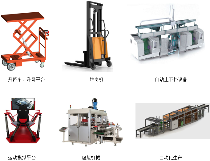 明视智能电动缸广泛应用于升降车、堆高机、动感座椅、模拟运动平台、包装机械、自动化生产线、上下料机械设备,安装使用简单方便,免除液压、气动繁琐的安装过程,没有液压站的庞大体积和液压油泄漏的可能,真正免维护性能可靠,在国家提倡绿色环保、节能低碳的大环境下势必大程度取代液压和气动缸。明视智能电动缸依据不同应用场合推出三类电动缸,满足不同客户的专业应用,分别是:升降车、堆高机等物流设备专用电动缸,通用型高精度伺服电动缸、适合低成本运动控制的无刷、步进电动缸(可配置霍尔输出)。